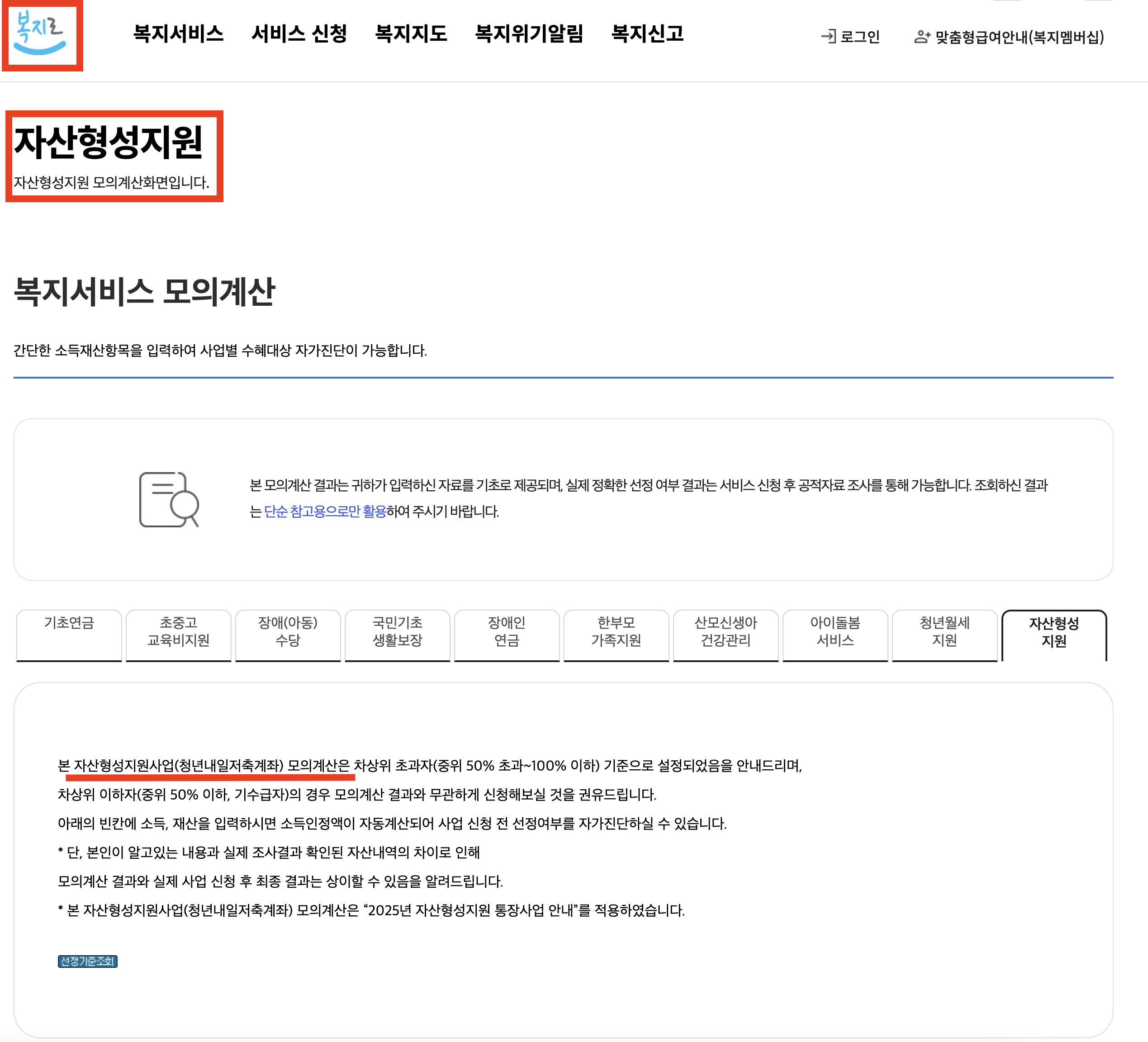 복지로 홈페이지에서 자격 조건이 맞는지 모의계산을 통해 확인하실 수 있습니다.