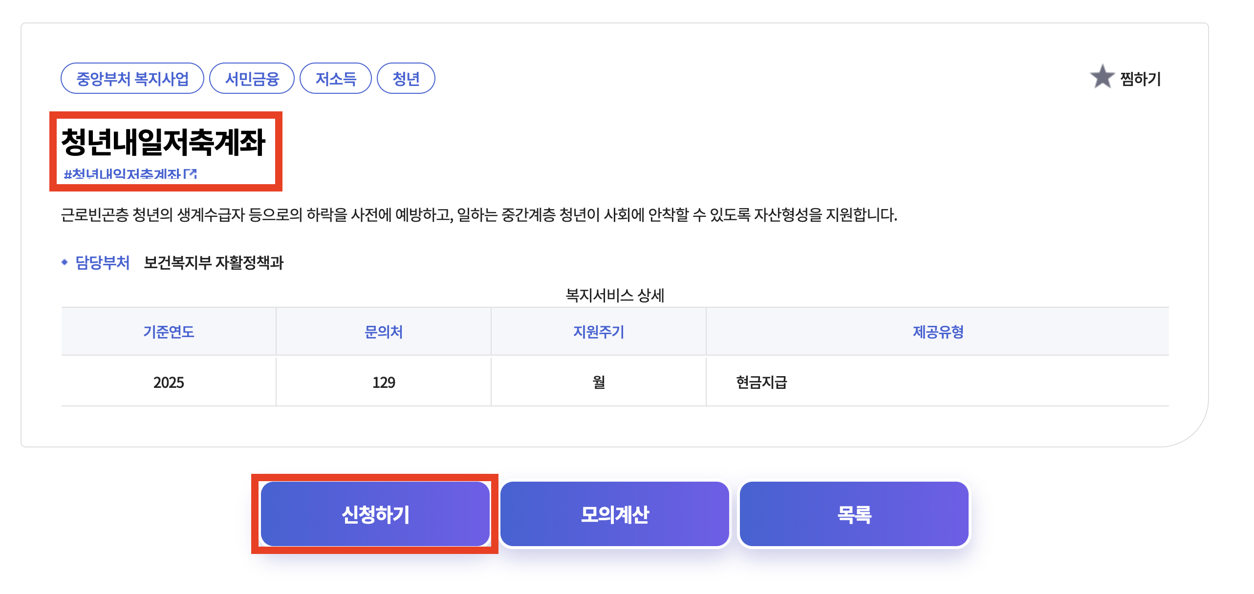→ 청년내일저축계좌는 연 1회 모집합니다. 따라서 해당 연도의 신청 기간을 놓치면 다음 해 모집을 기다려야 하므로, 반드시 모집 공고를 확인하고 기간 내 신청해야 합니다.