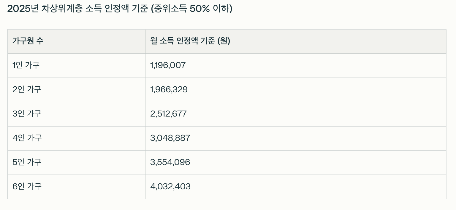 2025년 기준으로 가구 중위소득 50%(유형별 52~60%) 이하에 해당하는 가구가 이에 포함됩니다.