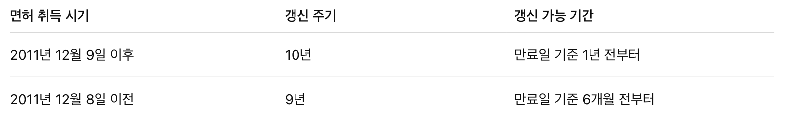 아래 표를 참고하여 면허 취득일 기준 자신의 갱신 시점을 정확히 확인하세요.