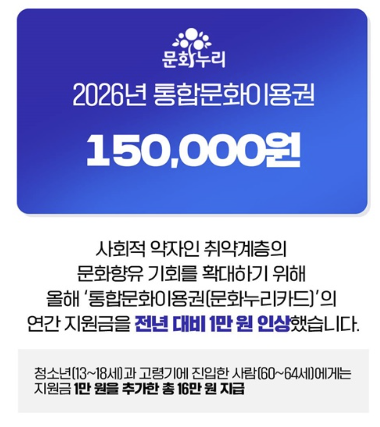 문화누리카드(통합문화이용권)는 2026년에 지원금이 인상되면서 체감 혜택이 더 커졌습니다.
